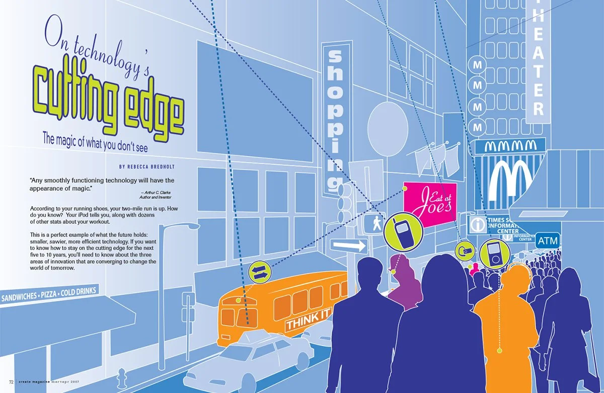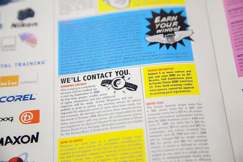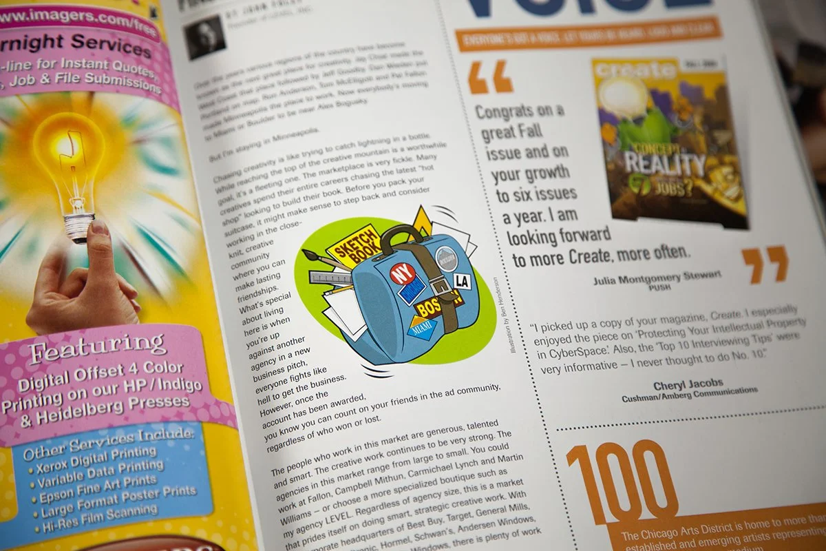 Create Magazine was a nationally distributed publication by creatives, for creatives. It was here that I continued to utilize my skills as a graphic designer, layout artist and illustrator. Throughout my time there I had the opportunity to help bring articles and stories to life with often simple illustrations, and even a mock comic book.